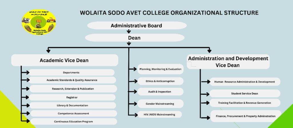Wolaita Sodo Agricultural Vocational Education and Training College operates under a strong governance framework designed to ensure academic excellence, administrative efficiency, and community service. The college is accountable to an Administrative Board and is led by the Dean, who oversees all academic and operational functions.